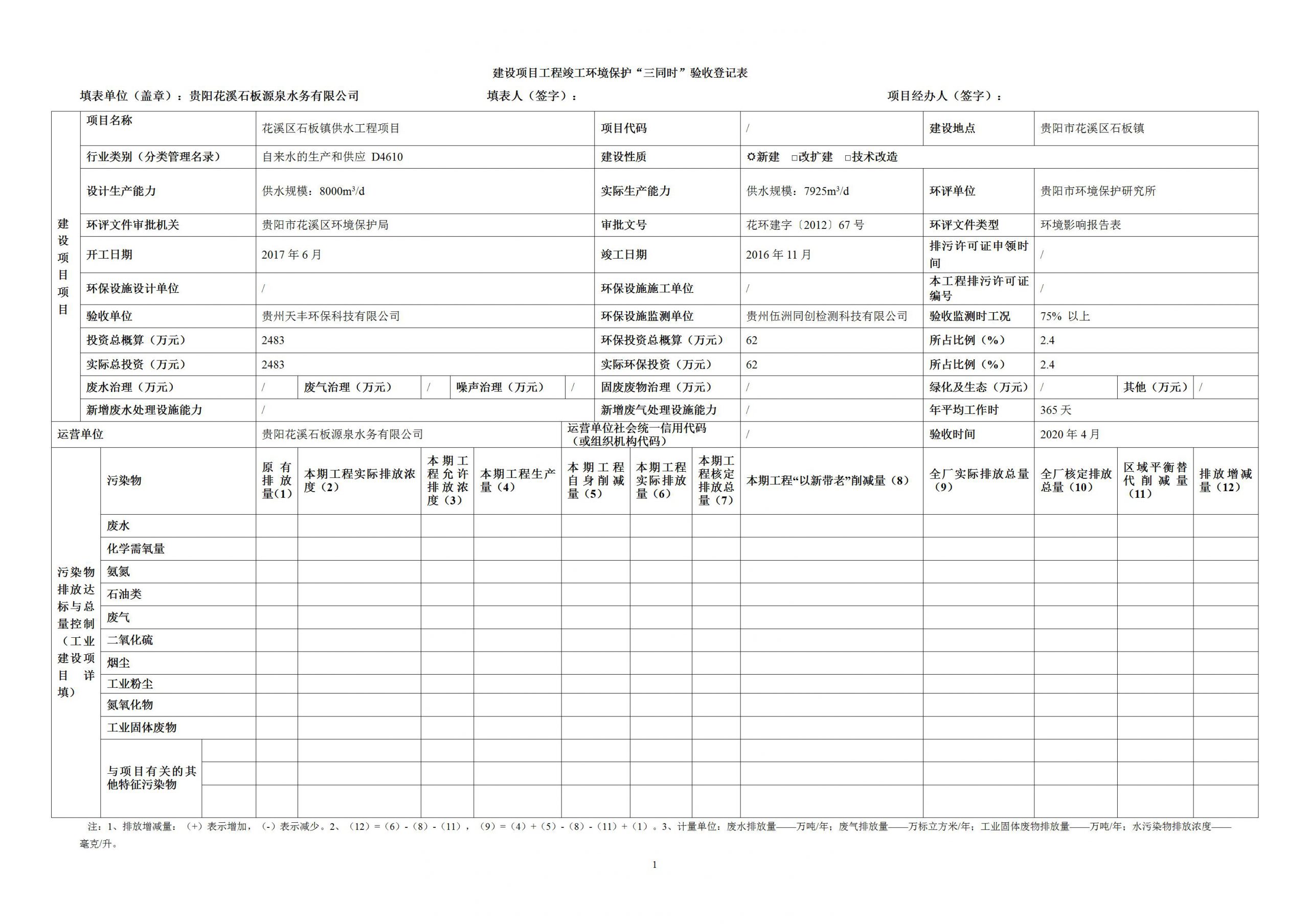 当前位置:网站首页 > 环保验收公示 > 关于《花溪区石板镇供水工程建设项目竣工环境保护验收》公示 > 建设项目竣工环境保护“三同时”验收登记表_01